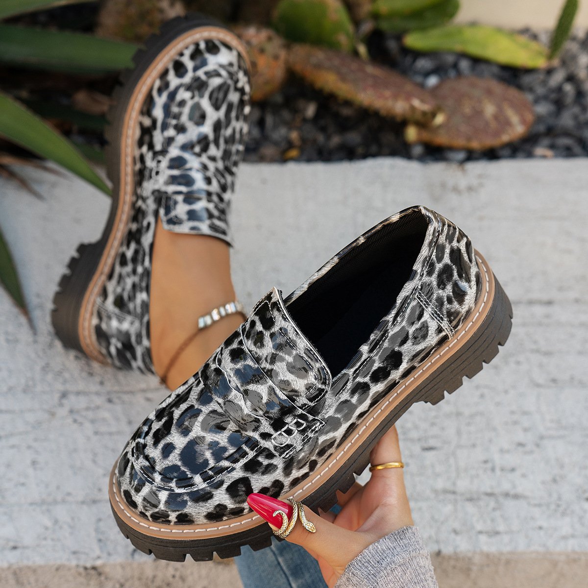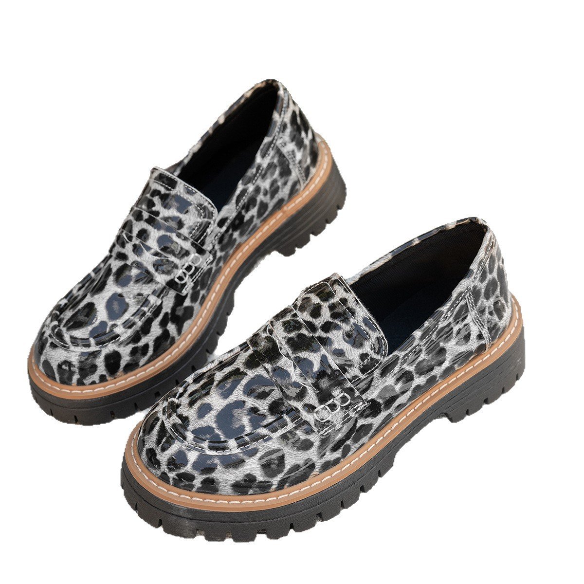 New Autumn Leather Belt-Buckle Patent Leather Leopard-Print Vintage Womens Shoes