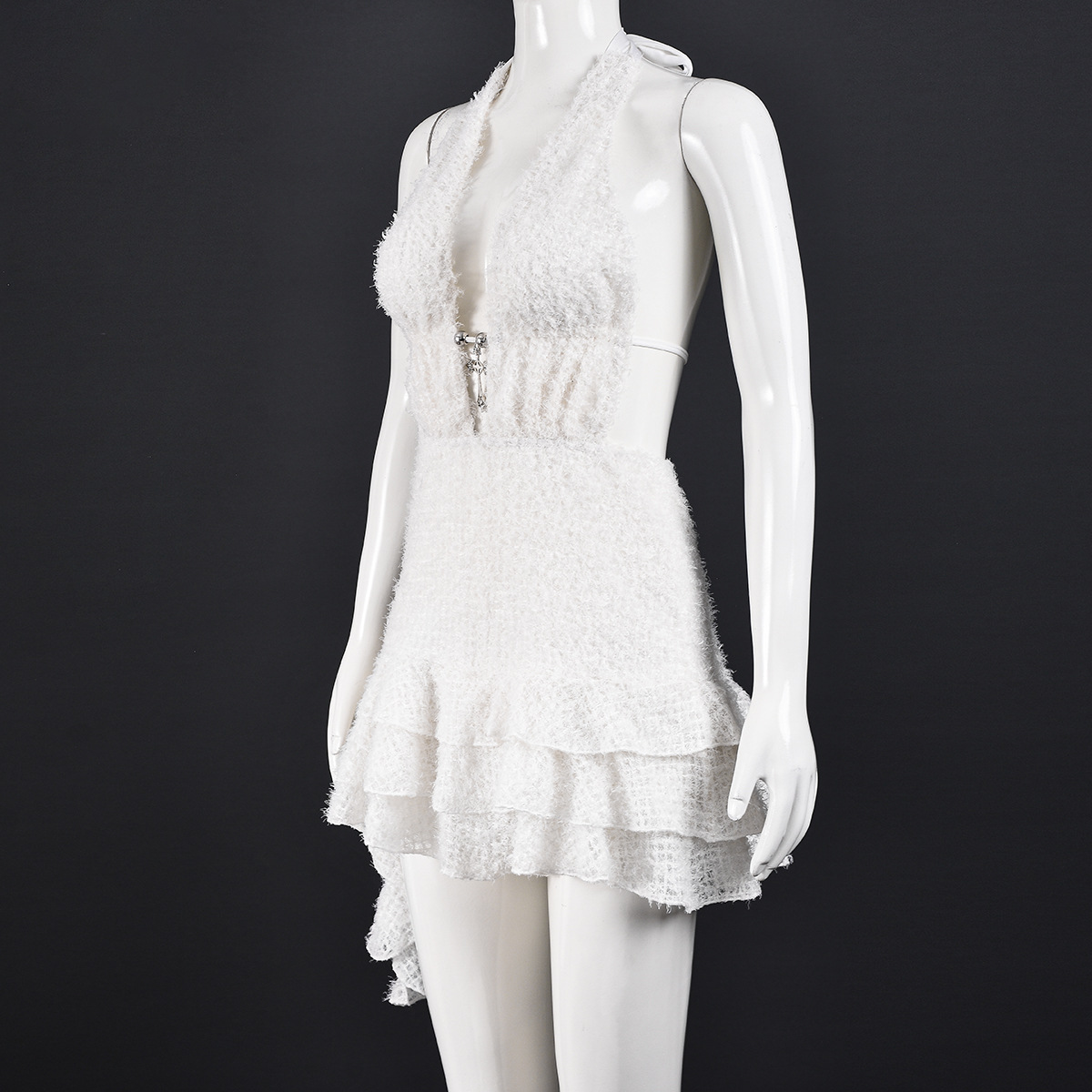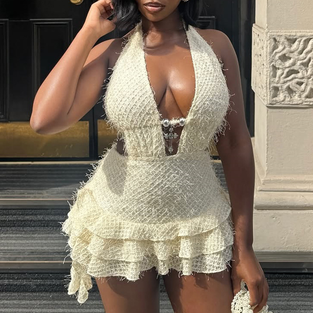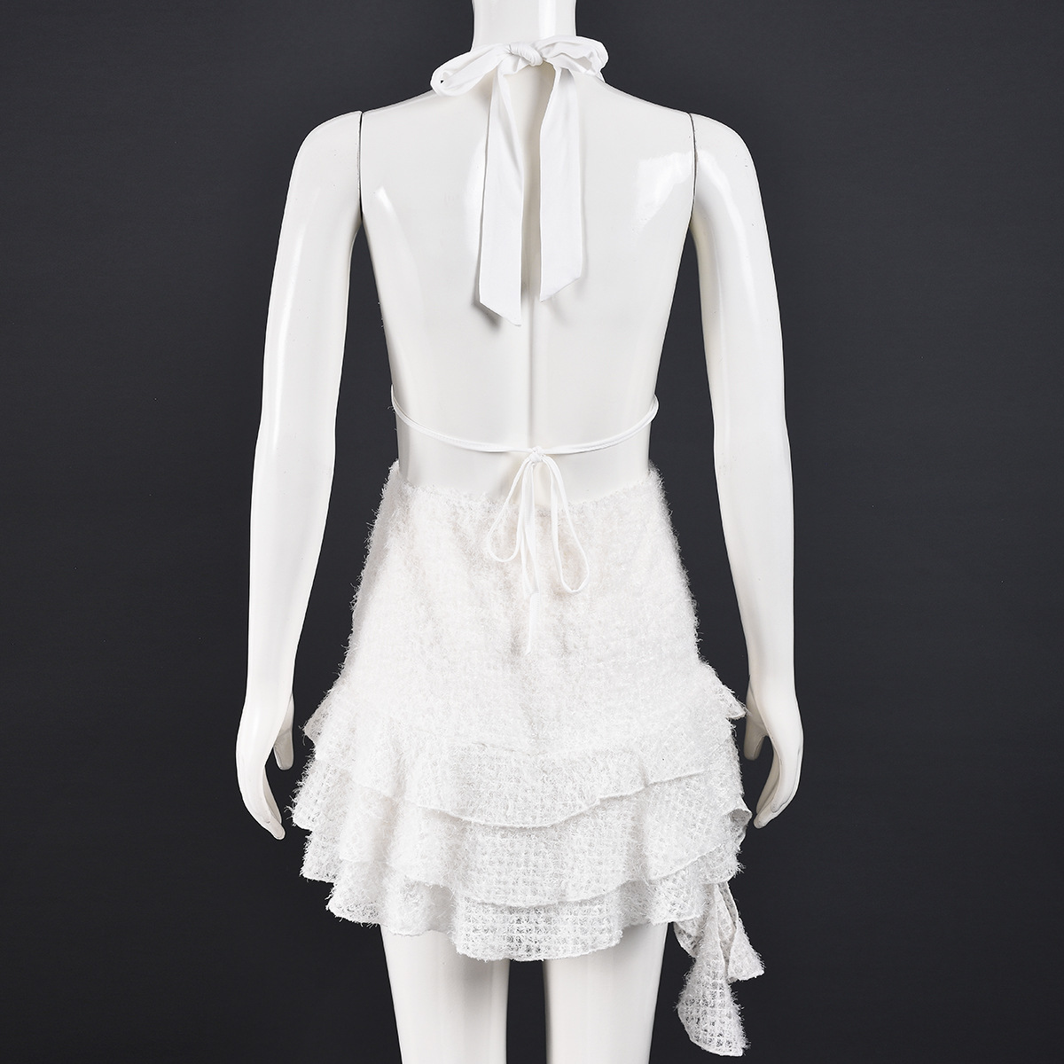 V-neck Hollow-out Pouf Skirt With Neck-tie Straps And A Backless Fine-fiber Mini Skirt