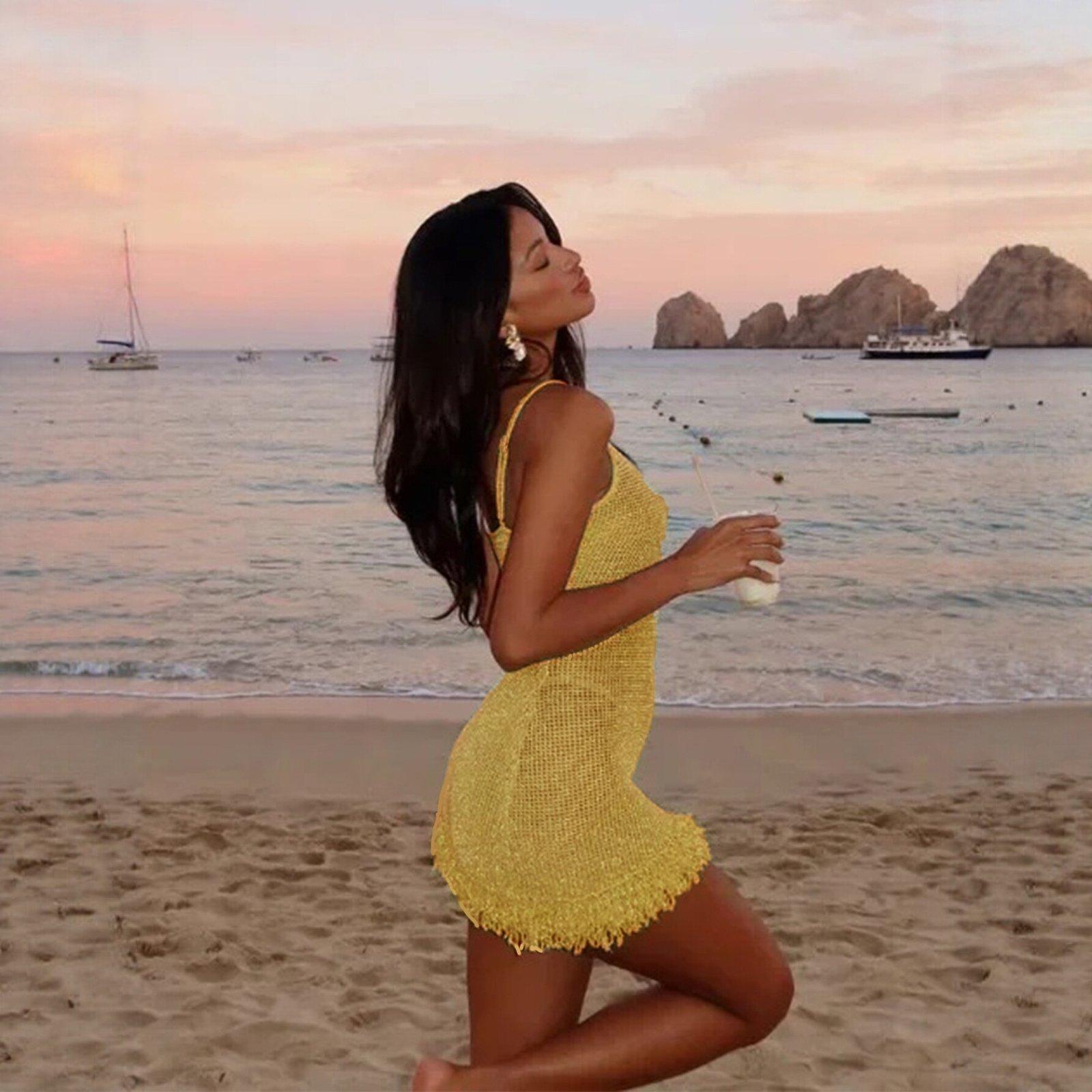 Features: Hollow-out knit, tassel details, thin shoulder straps, sleeveless