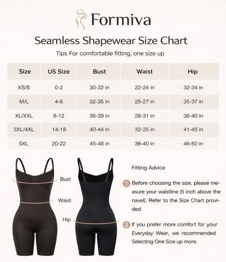 Measure your waist, bust, and hips to find your Formiva size. If your waist and hip measurements fall within different sizes, choose the larger size.